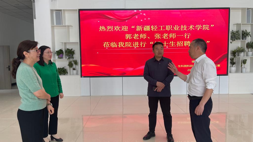2025年4月16日上午,新疆轻工职业技术学院组织部副部长郭瑶老师、食品工程学院副院长张志强老师走进塔里木大学生命科学与技术学院,开展专场博士生招聘会,搭建人才交流平台,共促学科发展与人才培养。此次活动受到塔里木大学生命科学与技术学院领导的高度重视与热情接待,生命科学与技术学院任道全院长,分管科研工作的梅院长出席会议并讲话。