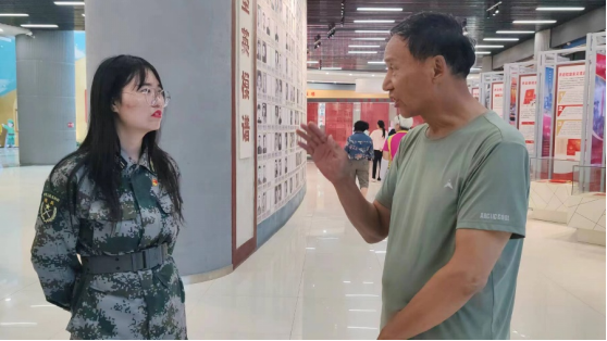 “这是我们新疆生产建设兵团地理位置示意图,根据这个地形图,我给大家解读一下身为兵团人的责任和义务。”实践团来到三五九旅屯垦纪念馆时,银发志愿者讲解员袁炳新正在给上海的游客讲解三五九旅的历史。自2020年3月加入银发志愿讲解员队伍以来,袁炳新老师已默默奉献四年有余,用他的声音和热情,让一段段历史重现生机。