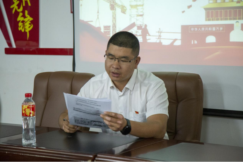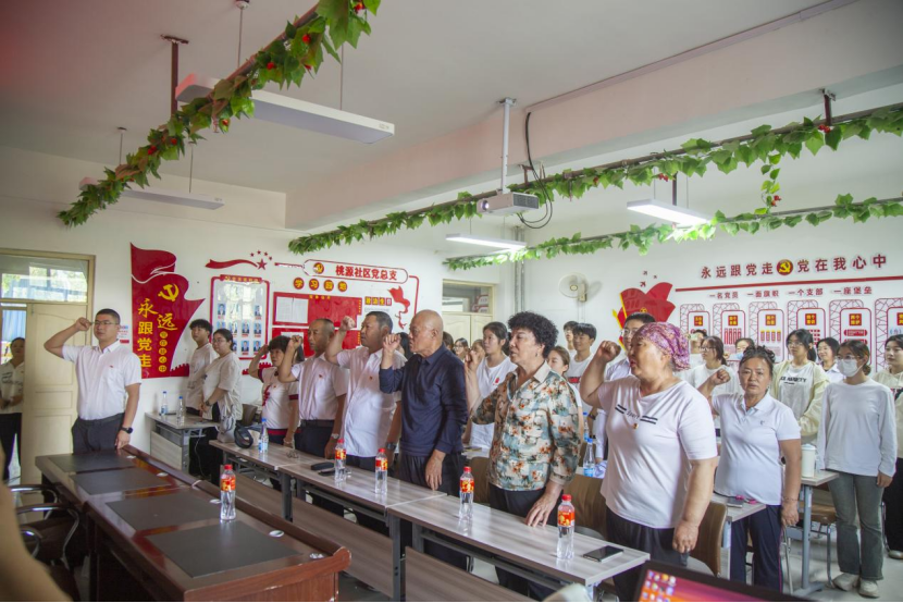 桃园社区党总支书记王春生领学习近平总书记在庆祝全国人民代表大会成立70周年大会上的讲话和《不合格党员处置的15种适用情形》。