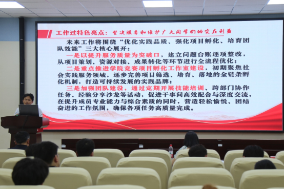 会上,学生会主席团、兼职团委副书记、各部门负责人及社团管理中心代表依次登台,围绕思想引领、组织建设、品牌活动、服务效能四大维度,通过PPT、视频、数据图表等形式进行述职汇报。