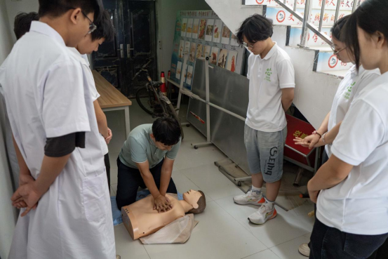 在急救知识环节,医护人员利用人体模型道具,现场演示了心肺复苏、海姆立克急救法等常见急救技能的操作步骤,并邀请学生们上台进行实践操作,手把手指导他们掌握正确的急救方法。学生们积极参与,认真学习,在实践中增强了应对突发紧急情况的能力。