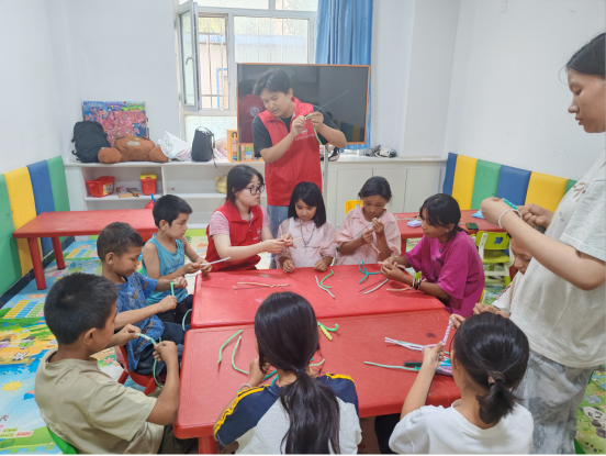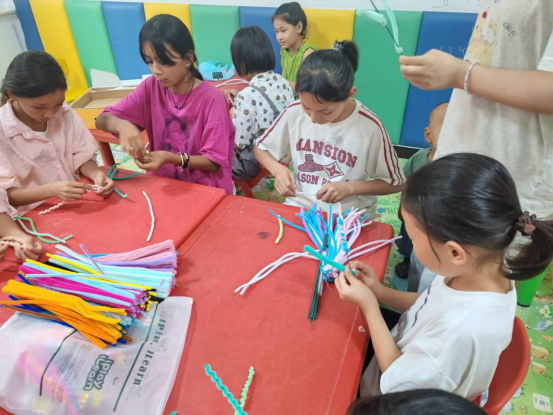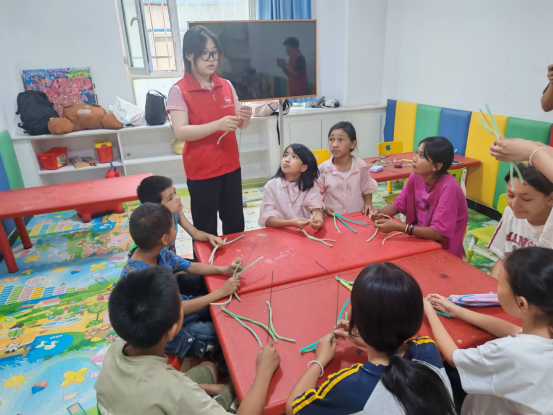 手工教学环节堪称“知识与创意的交响曲”。志愿者韩雨晴将扭扭棒编织步骤与植物科学知识巧妙对应:“先卷出螺旋状花芯,就像真实花朵的雌蕊和雄蕊;再交错叠加花瓣,注意层次要模仿月季自然绽放的形态;最后加上锯齿状叶片,这可是植物进行光合作用的‘魔法绿毯’。”制作过程中,志愿者们不断抛出启发性问题:“为什么叶子上有叶脉?”“如果花朵没有花瓣会怎样?”引导孩子们将手工实践与自然知识融会贯通。当看到自己制作的扭扭棒花朵与真实植物结构高度契合时,孩子们兴奋地围坐讨论,热烈探讨“人工花”与自然花在形态、功能上的异同,思维的火花在实践中不断迸发。