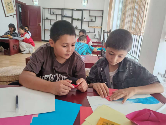 活动伊始,伴童心同行志愿服务团的志愿者们以趣味问答开场,随后,化身折纸老师,分步示范荷花、房屋、树木等折纸技巧,孩子们手持彩纸,认真跟随折叠、翻转、粘贴,不一会儿,色彩缤纷的立体折纸作品便铺满桌面。