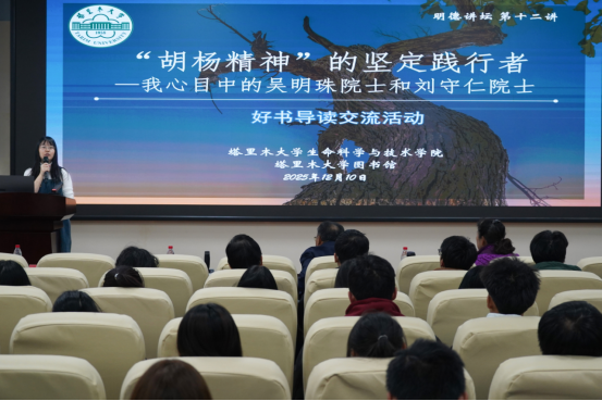 此次明德讲坛好书导读交流活动的圆满举办,不仅让现场师生深入了解了两位院士的先进事迹,更让大家对胡杨精神的时代内涵有了更为深刻的认识,为学院师生搭建了思想碰撞、精神传承的重要平台。下一步,生命科学与技术学院将持续以明德讲坛为载体,不断丰富活动形式与内容,厚植学术底蕴,传承精神力量,为学院高质量发展注入强劲动力。(文/许疆维 摄/胡世荣)