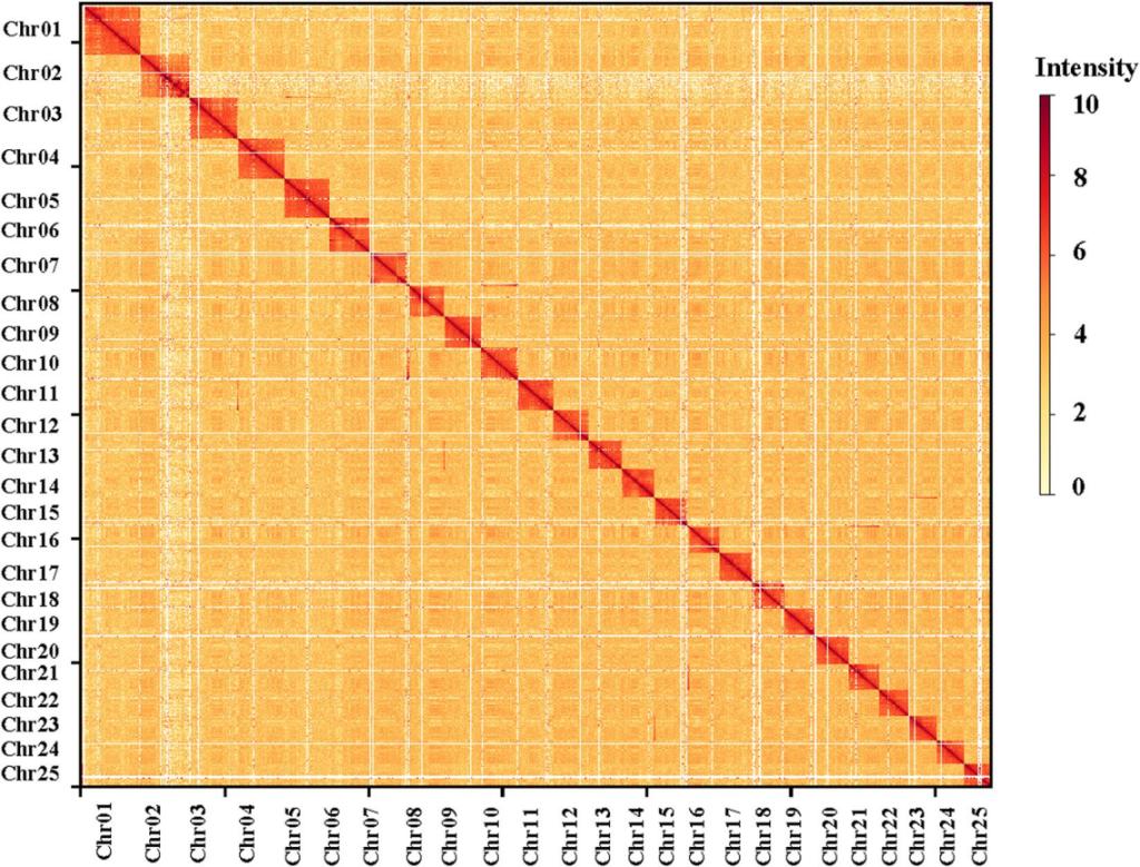 Hi-C互作矩阵热图,展示染色体组装的完整性