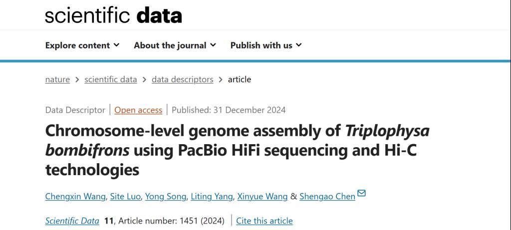 塔里木大学陈生熬教授团队在国际知名期刊《Scientific Data》发表了题为《Chromosome-level genome assembly of Triplophysa bombifrons using PacBio HiFi sequencing and Hi-C technologies》的研究论文。该期刊为Nature旗下开放获取期刊,同时为中科院SCI二区期刊,影响因子5.8。王程欣博士为论文第一作者,陈生熬教授为通讯作者。该研究利用PacBio HiFi测序和Hi-C技术,对Triplophysa bombifrons(隆额高原鳅)进行了染色体水平的基因组组装,填补了该物种基因组学研究的空白。