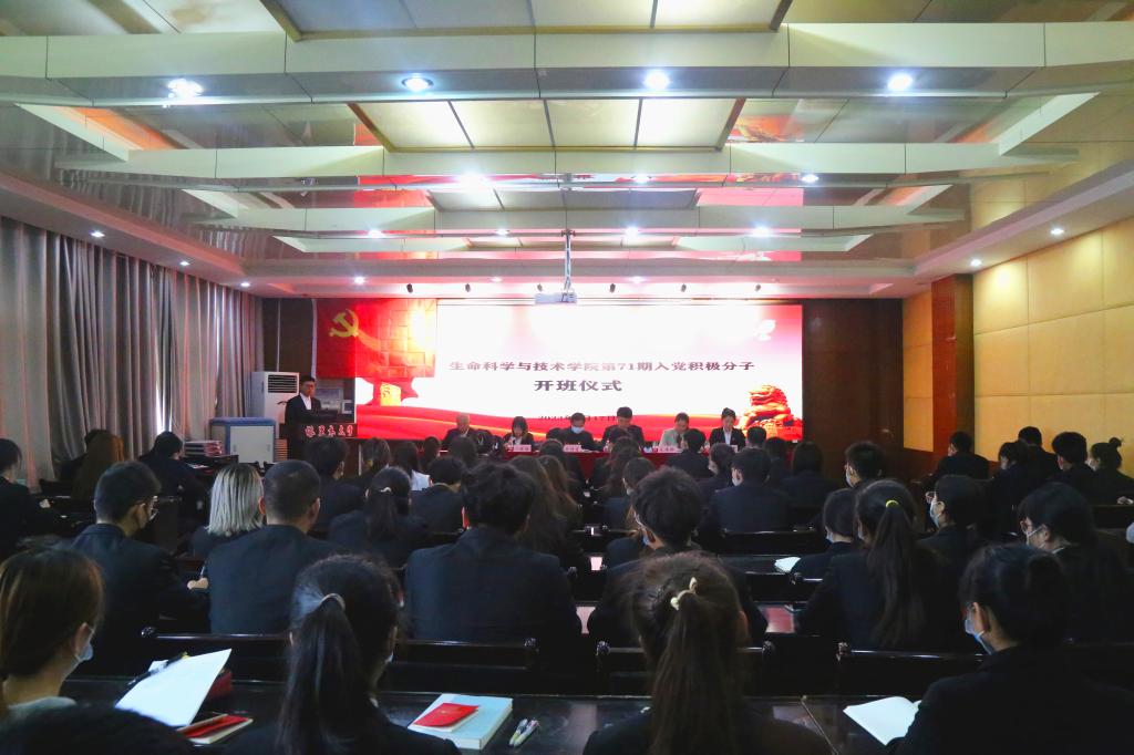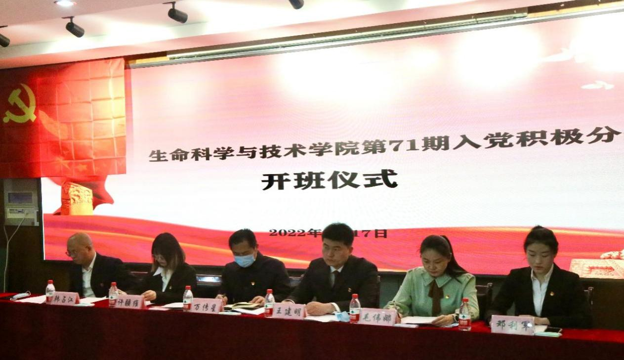 为进一步加强入党积极分子的教育培养、提高发展党员工作质量, 4月17日,生命科学与技术学院在研发中心419举行第71期入党积极分子培训班开班典礼。学院党委副书记院长万传星,党委副书记王建明,学生支部书记毛伟娜、研究生支部书记许疆维、学生支部委员邓利军及60余名入党积极分子参加。开班仪式由生物系党总支书记韩占江主持。