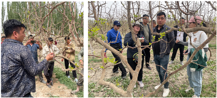 托万克巴格托格拉克村一处红枣地病害严重,专家团队向村民们介绍红枣病害的基础知识及目前可采取的防治措施,并在现场对枝条修剪进行指导与培训。