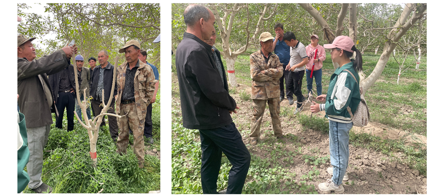 玛坦村一处核桃地腐烂病严重,特派团队向村民们进行核桃病害的防治知识、干枯枝修剪、浇水、施肥方式等相关知识,并进行现场指导与培训。(文/摄 刘慧美)