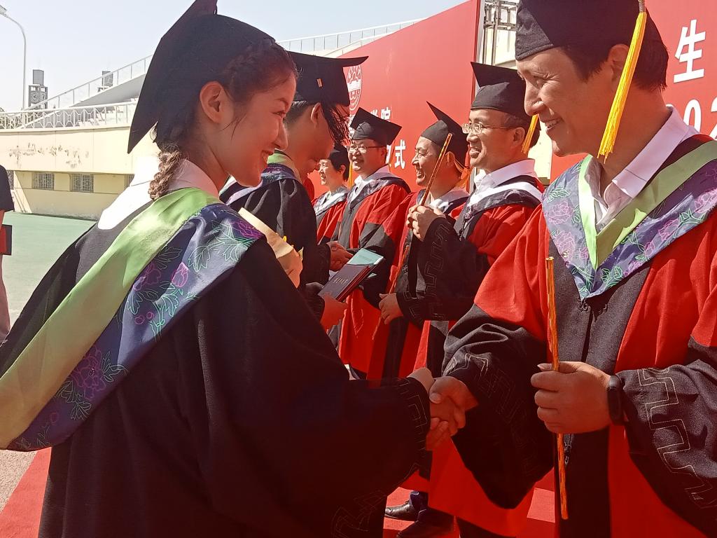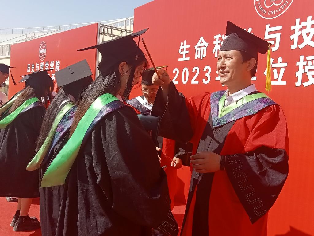 上午9时,伴随着庄严的升国旗仪式、嘹亮的奏唱国歌声和军乐团演奏声,塔里木大学2023年毕业典礼暨学位授予仪式在西区运动场拉开帷幕。与会全体老师为毕业生颁发学位证书,扶正流苏,合影留念。