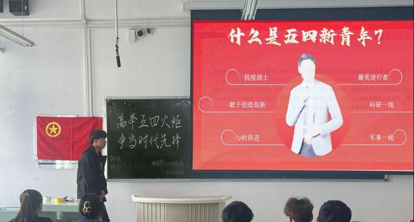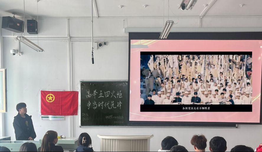 团支书带领全体团员宣读入团誓词,向同学们讲述革命先烈感人事迹,以传承五四爱国精神为目标观看《建党伟业》影片。