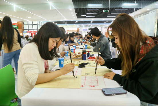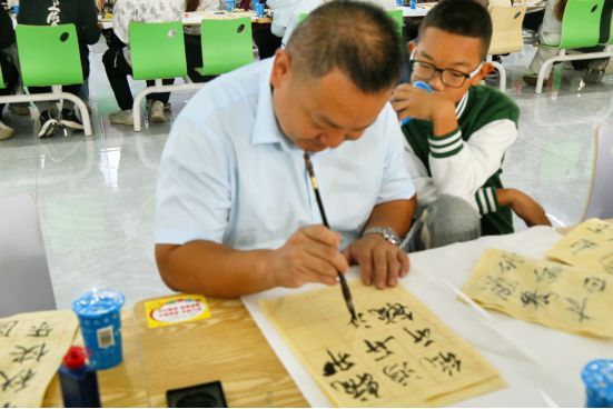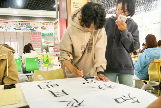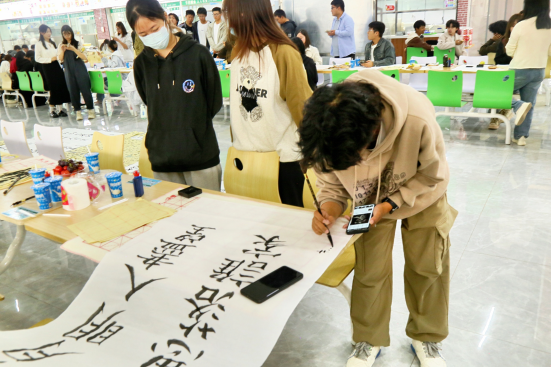 活动现场处处洋溢着喜庆祥和的气息:餐桌上,香甜的月饼、新鲜的水果整齐摆放,师生围坐其间,分享美食的同时畅聊家常,团圆的暖意悄然流淌。多项沉浸式文化活动更让现场活力满满——“翰墨寄情”书法体验环节中,师生们纷纷提笔蘸墨,在洁白宣纸上挥毫书写“但愿人长久,千里共婵娟”“海上生明月,天涯共此时”等经典中秋诗句。或刚劲有力,或娟秀灵动的字迹,不仅尽显中华书法的独特魅力,更将对美好生活的期盼与对民族文化的热爱融入笔墨之间。