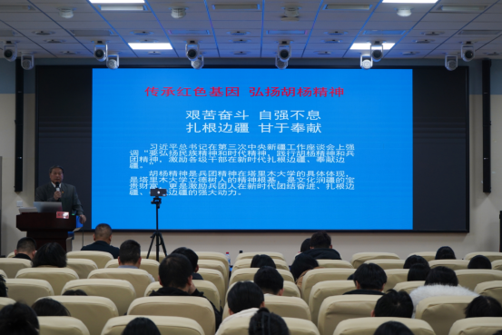 随后,王合理教授以“传承胡杨精神,赓续红色血脉”为主题开展专题讲座。作为深耕塔里木大学多年的老教师,王合理教授结合自身在学校的工作经历与塔里木大学的发展历程,生动阐释了胡杨“生而千年不死、死而千年不倒、倒而千年不朽”的精神内核。他指出,塔里木大学自创办以来,始终与胡杨精神紧密相连,一代代塔大人正是凭借着这种坚韧不拔的精神,在边疆教育事业中攻坚克难、砥砺前行。讲座中,王合理教授还分享了诸多校史中的红色故事,让在场师生深刻感受到胡杨精神与红色血脉在学校发展中的传承与延续,引发了师生们的强烈共鸣。