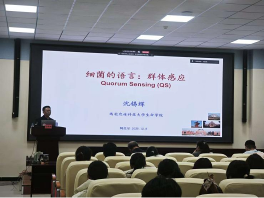 聘任合同签订仪式结束后,沈锡辉教授在塔里木盆地生物资源保护利用重点实验室B302会议室作题为《细菌的语言:群体感应》的学术报告,系统阐述了群体感应及真核生物与原核生物间信号分子的作用机制,生命科学与技术学院师生参加报告会。